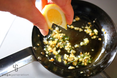 3の粗熱が取れたら、レモンを絞り混ぜ合わせる。 -