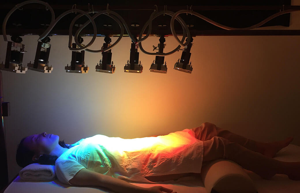 チャクラとは、感情や想いを身体とつなげるエネルギーポイントで、背骨に沿って7つあると考えられています。また、それぞれのポイントに対応する色があるといわれ、カラーセラピーでは専用のマシーンを使って、第1チャクラから順に、各チャクラに対応するカラーライトを照射。そうしてチャクラバランスを整えていきます。