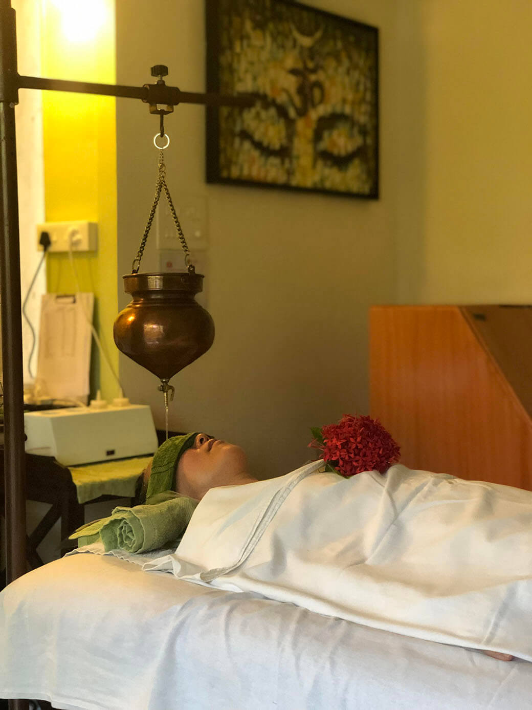 クリニックでは、問診から導き出した、わたしの体質にフィットするオイルを使ったマッサージを毎日していただきました。マッサージには額にオイルを垂らすシロダーラもあれば、セラピストがふたりがかりで、全身の細胞にオイルを刷り込んでいくアビヤンガもあります。