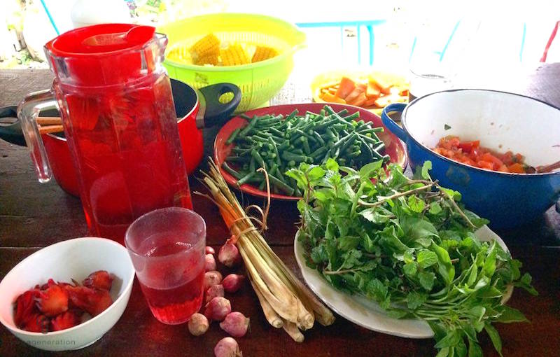 スムージーは前出のオーガニック畑で仕入れたケール、パパイヤ、パイナップル、バナナ、リンゴをミキサーにかけて、仕上げにライムをひと搾り。フレッシュな果物は南国の宝物。だからこそ、スムージーの美味しさもひとしおです。