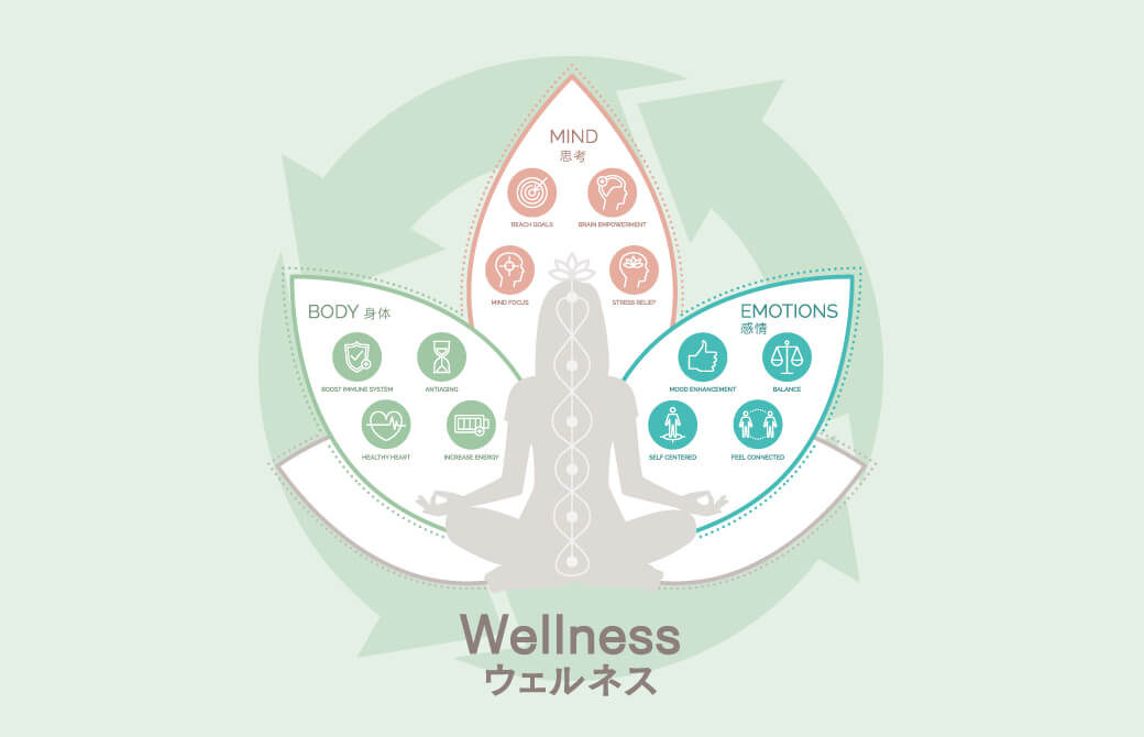 こうした背景によって、見直されるようになった言葉が「ウェルネス/Wellness」。先に記した「健康」の定義に踏み込み、かつより高く広い視点から見た健康観を意味します。1961年、アメリカの医学者、ハルバート・ダンによって提唱され、作られた言葉です。