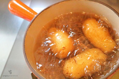 - ジャガイモの皮はお好みで付いていてもOK。取り除きたい場合は茹で上がってすぐに剥いておく。