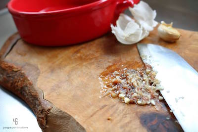 ニンニクとアンチョビをそれぞれみじん切りにしたら、両方を一緒に合わせてさらに包丁で叩くようにみじん切りする。 -