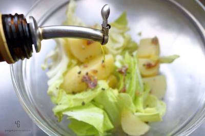 ボウルに一口大に切ったジャガイモとざく切りしたキャベツを入れ、2と塩、お好みのドライハーブを加えてよく和える。