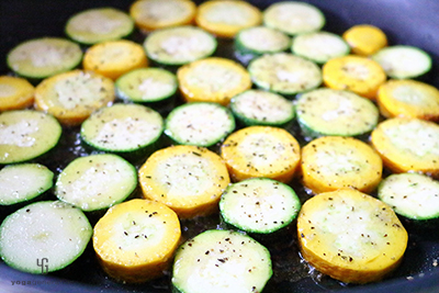- ズッキーニは新鮮なほど水分が多いので、切ったらすぐに焼き、焼きたてを頂く。