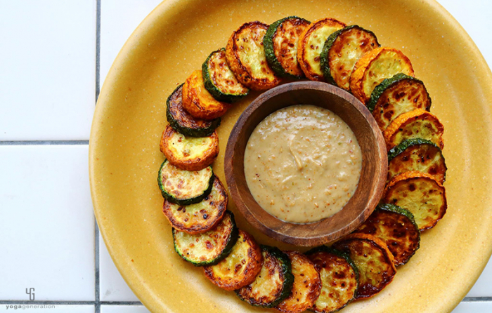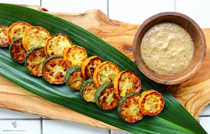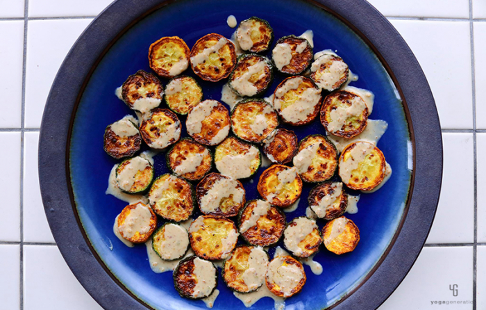 フライパンに多めの油を注ぎ、強火で加熱する。スライスしたズッキーニを並べ、塩・胡椒を振り入れて、両面にこんがり焼き目を付け、1のソースを添えて頂く。