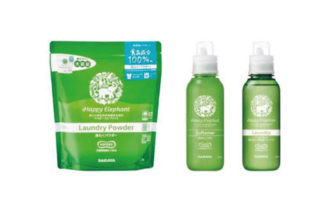 ハッピーエレファント液体洗濯洗剤コンパクト(600㎖)、ハッピーエレファント柔軟仕上げ剤(600㎖)、ハッピーエレファント洗たくパウダー(1.2㎏)。すべてオープン価格。