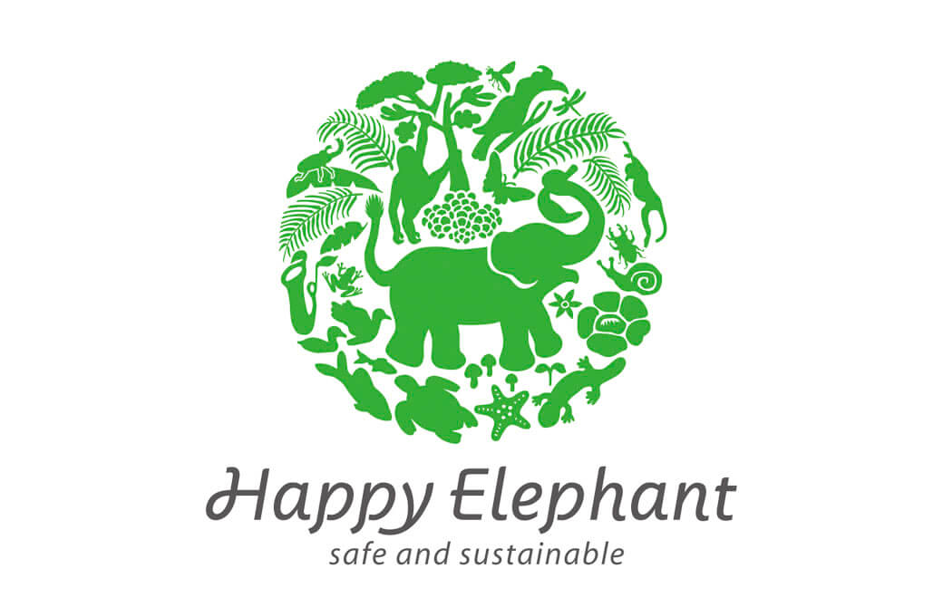 『Happy Elephant』を生み出したサラヤは、約20年前に、原材料の一つである植物油の生産地であるボルネオで、熱帯雨林が不法に伐採されているという現状を目の当たりにし、そこで傷ついた象に出会った。森に暮らす象が畑に入り、それを嫌う農民達に傷つけられていた。植物油を使用しない選択肢もあるが、すでに世界で食用としての需要が高まり、現地の人々にとっても重要な産業となっていることから、サラヤは環境と産業の共存を探る活動を開始。マークには、象を中心に熱帯雨林の野生動物が描かれ、彼らが幸せになれば、みんな幸せになるという思いが込められている。