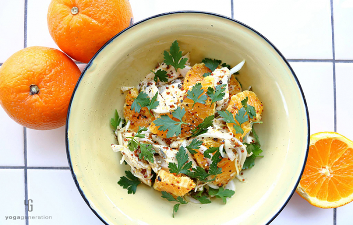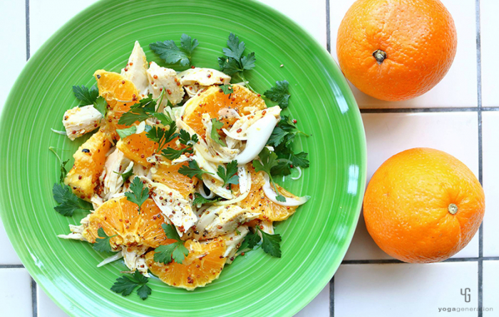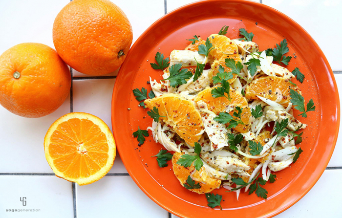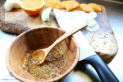 鶏肉を蒸している間に、オレンジと玉ねぎをスライスする。ドレッシングとなる材料3を合わせて好みの塩加減にし、最後にエクストラバージンオリーブオイルを加えて味を調える。 -