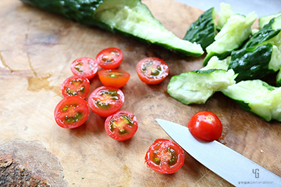- トマトは縦に二等分するよりも、上下で二等分する方が味の馴染みが良くなります。