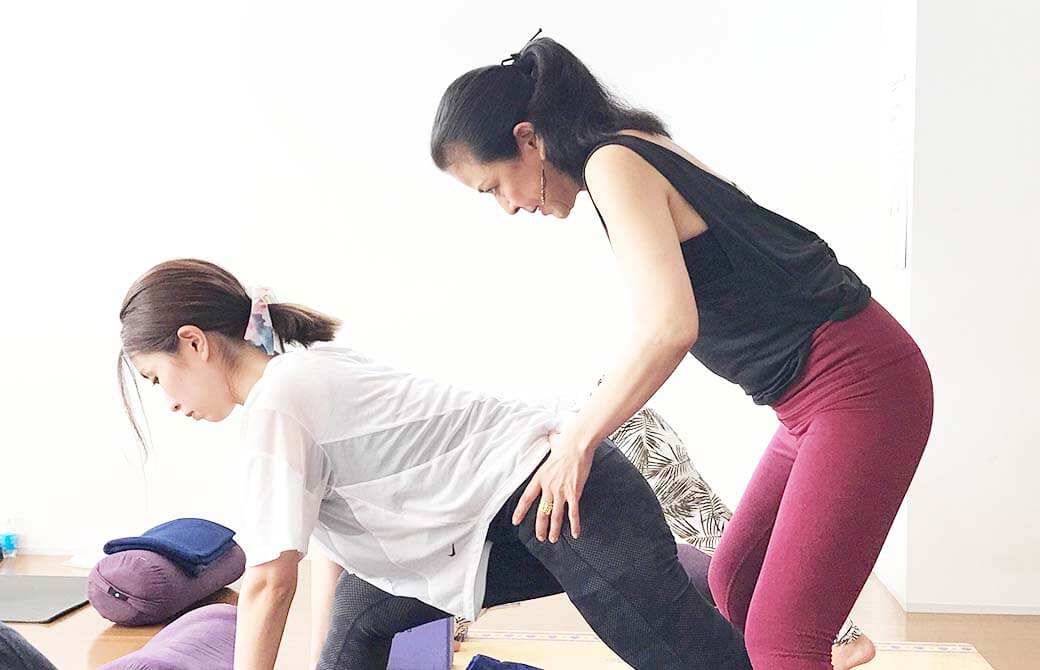 通常クラスでは、誰が実践しても一定効果が得られるようなインストラクションをしていますが、たとえばダウンドックひとつとっても、その最終形は、一人ひとりが違って当たり前です。それぞれの可動域、安定するポジションへと誘導し、決して無理をさせないようにすることをとても大切にしています。