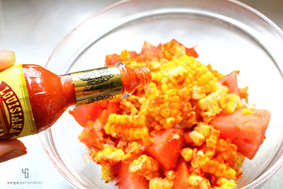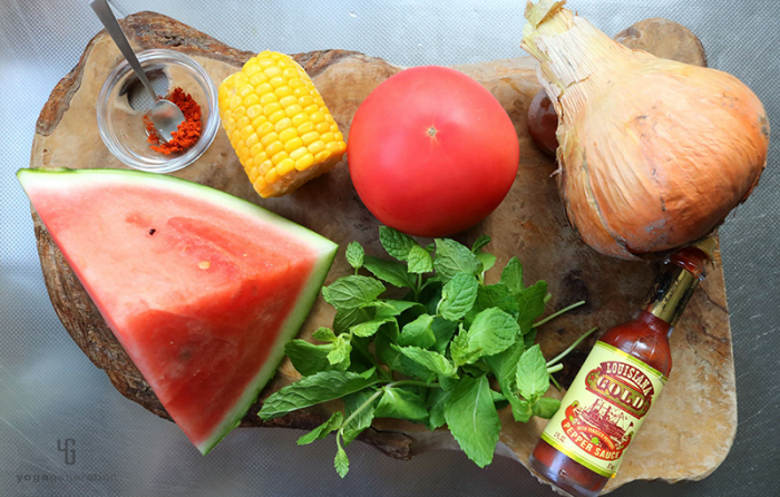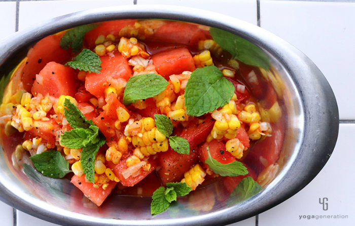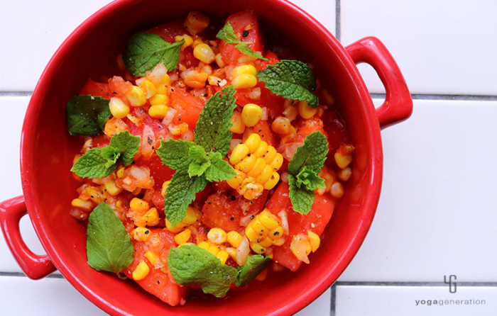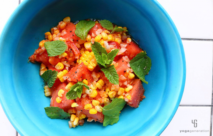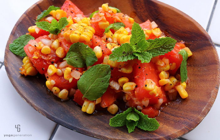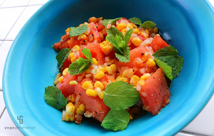 甘いスイカとトウモロコシに酸っぱいトマト。塩をしっかり効かせて、そこにメキシカンなスパイスとはちみつ。仕上げにミントを散らしてエキゾチックな味わいに仕上げてみました。