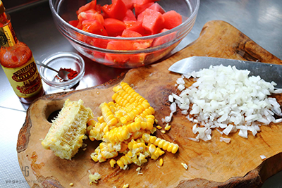 タマネギは粗いみじん切り、茹でトウモロコシは軸から削ぎ取る。 -