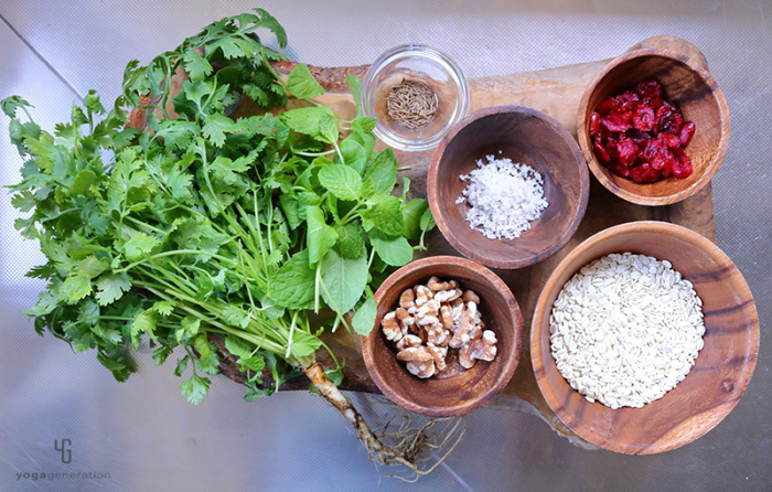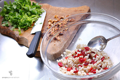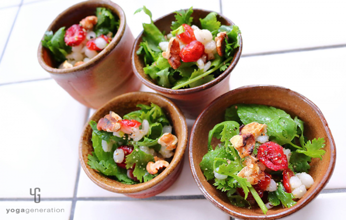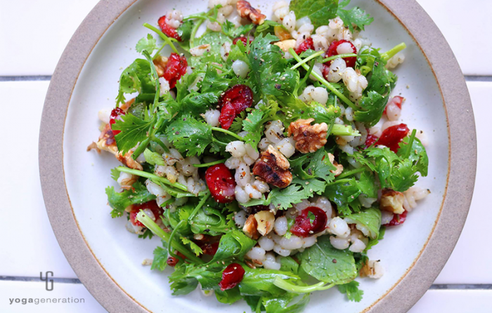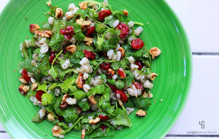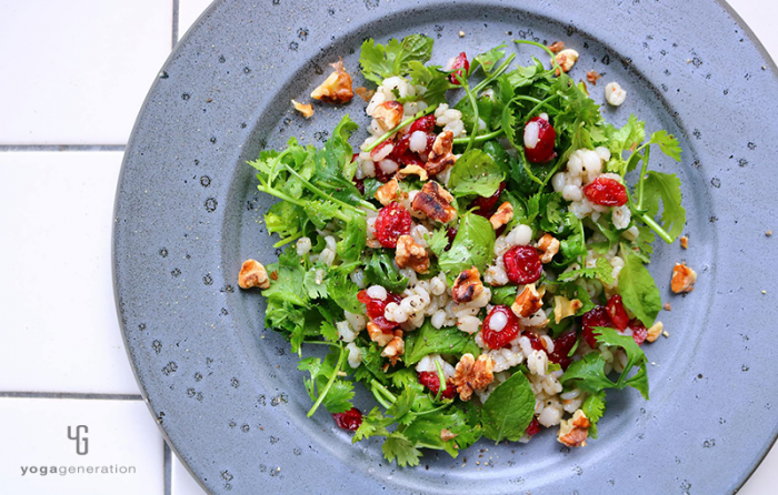押し麦の原料である大麦は、小麦よりもグルテンが少ないそう。また食物繊維が豊富で腸内バランスを整える手助けをしてくれます。クランベリーはポリフェノール、ビタミンCをはじめとするさまざまな抗酸化作用のある栄養素が豊富に含まれていて美肌効果も期待できるかも?!ビタミンEを含むクルミにフレッシュなハーブ達を合わせて、栄養バランス・食感・彩り、すべてに嬉しいサラダです。