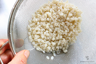 押し麦はザルに入れて洗い、鍋に入れる。押し麦の2〜2.5倍の水とひとつまみの塩を加えて弱火で13〜14分くらい茹でる。火を止めて、手で鍋を触れられるくらいまで冷ます。 -