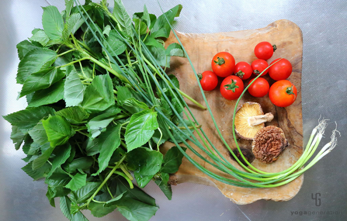 干し椎茸を戻している間に、食材の下ごしらえをする。モロヘイヤは簡単に葉と茎に分け、茎は1cmくらいに、葉はざく切りにする。トマトは大きければカットする。細ねぎは小口切りにする。 -