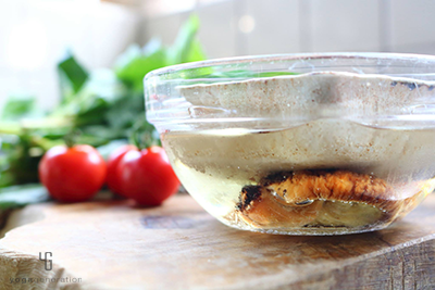 干し椎茸は水に浸し、皿などで重石をして戻す。 -