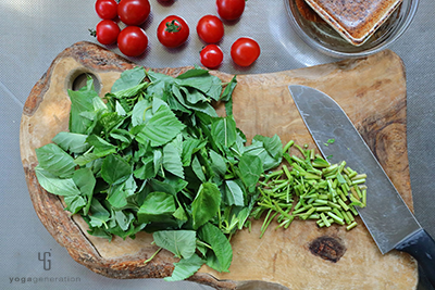 基本の白い器でモロヘイヤの緑とトマトの赤を楽しみます。
