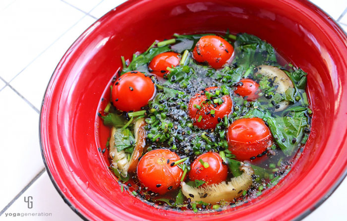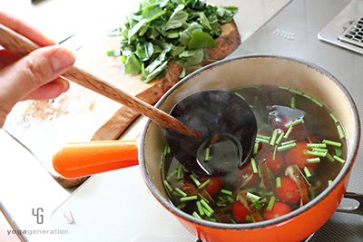 沸騰する手前でモロヘイヤの軸とトマトを加えて一煮立ちさせ、塩と醤油を加えて少し強めの塩味に味わいを調える。 -
