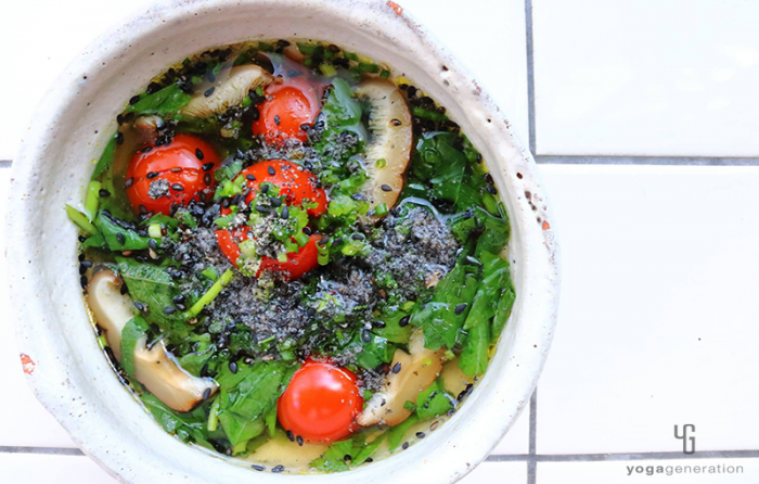 モロヘイヤの葉を加えて一煮立ちさせたら器によそう。お好み量の黒酢を加えてひと回しし、仕上げにごま油をまわしかける。