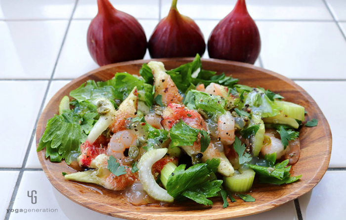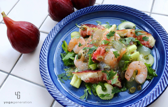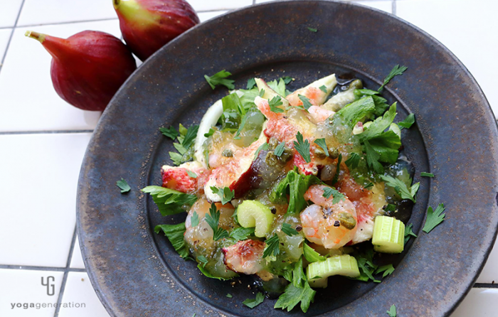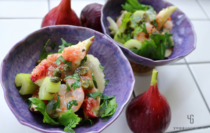 器にエビ、イチジク、セロリを盛り付け、8のドレッシングを添える。お好みで粒黒胡椒を砕いて散らす。