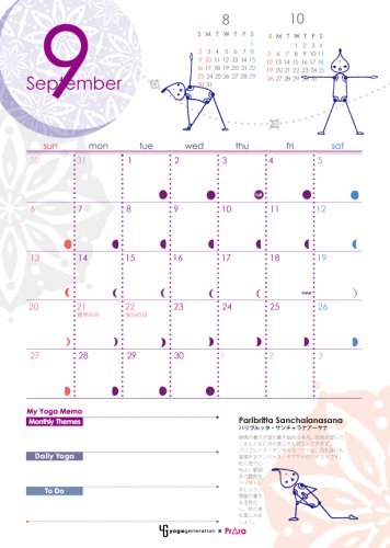 9月は一年のうちでも月の美しさが際立つ時期。ヨガジェネカレンダーで満月や新月など月の満ち欠けを確認しながら、初秋の空気をたっぷり体に取り込んでみてくださいね。