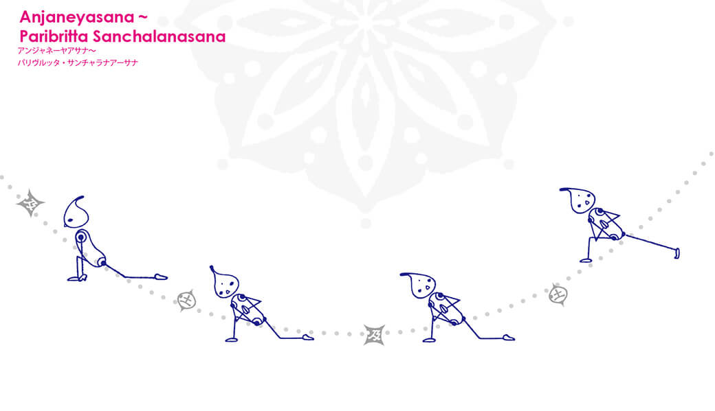 2020年、9月にオススメのアーサナはパリヴルッタ・サンチャラアーサナです。月礼拝でもおなじみのアンジャネーヤ・アサナから上体をツイストし、呼吸とともに背骨の捻りを深めてみましょう。