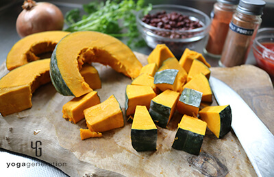 カボチャはワタを取り除き2〜3cm角に、玉ネギとニンニクは粗みじん切りにする。 -