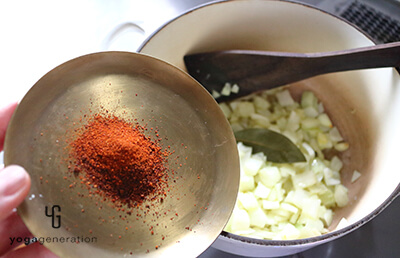 厚手の鍋にエクストラヴァージンオリーブオイルと1の玉ネギとニンニクを入れ、弱中火でざっと混ぜながら火を通す。玉ネギが半透明になったら塩胡椒して炒め合わせ、さらにチリパウダーとチリペッパーを加えて炒める(※ちょっと一工夫を参照)。 -