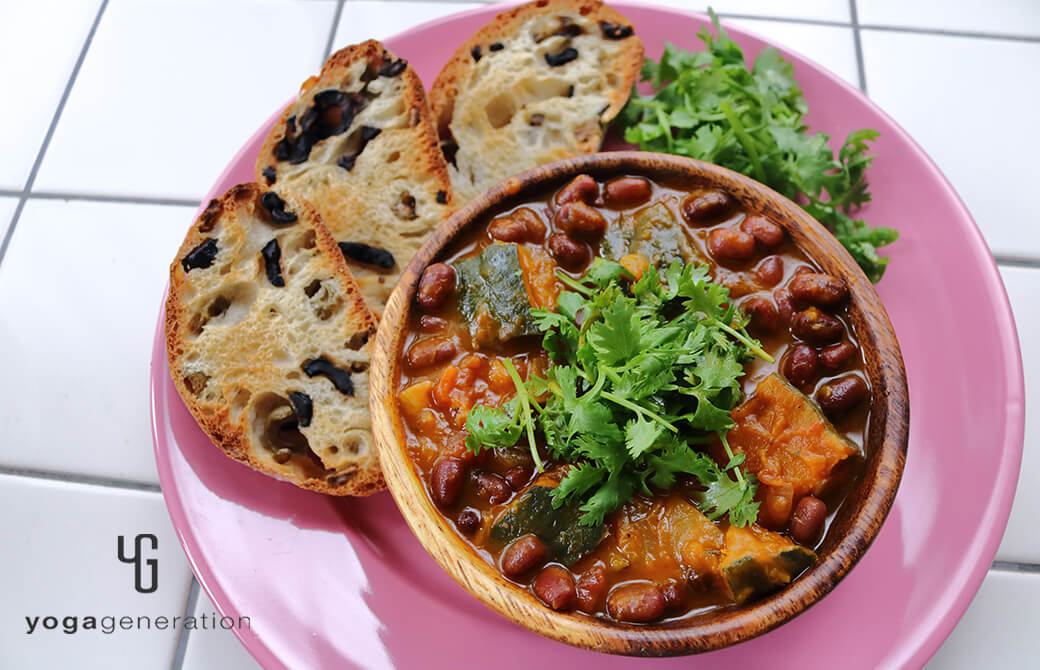 カボチャと小豆のメキシカンな『いとこ煮』にトーストを添えて トーストしたパンを添えても。ガーリックトーストにしたら、ちょっとした前菜にもなりますね。