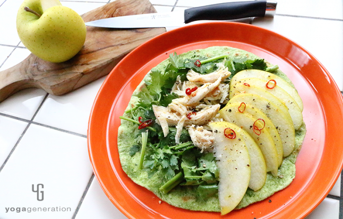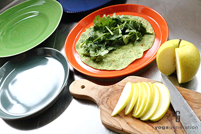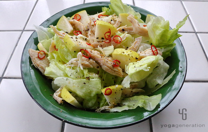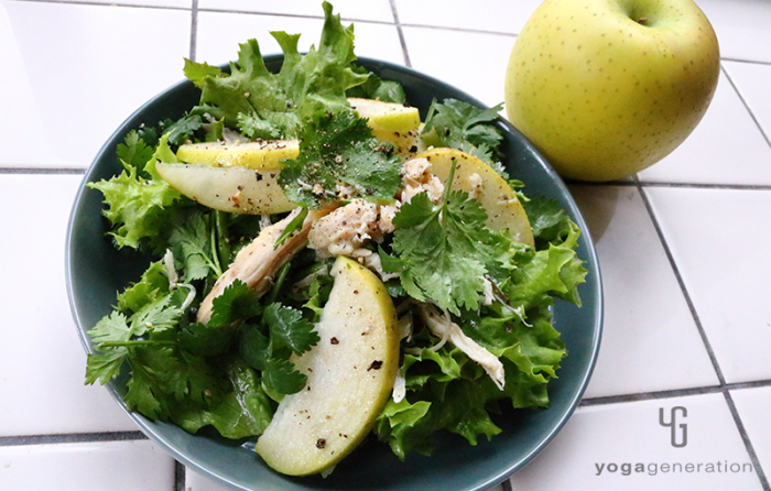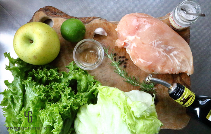 鶏肉を冷ましている間にグリーンリーフを洗い、よく水を切っておく。青リンゴは縦のいちょう切りにする。 -