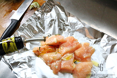 鶏胸肉は油を取り除き、大きめの一口大に切る。アルミホイルを大きめに2枚カットして重ね、その上に切った鶏肉を移す。材料2を加えてよく手で揉み込む。 -
