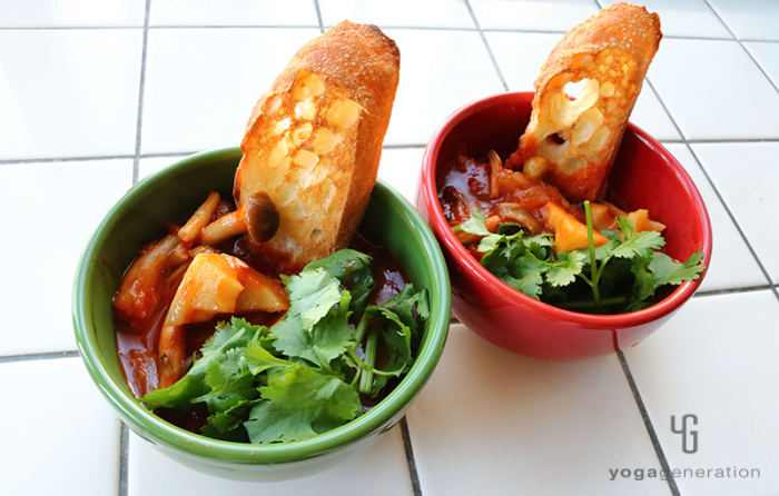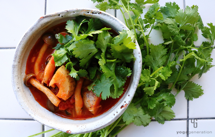 スープの赤とパクチーの緑、両方の色合いを活かしたコーディネートも美しくて、ワクワクするような色合いですね!こんがりトーストしたバゲットを添えて、食べ応えも十分。