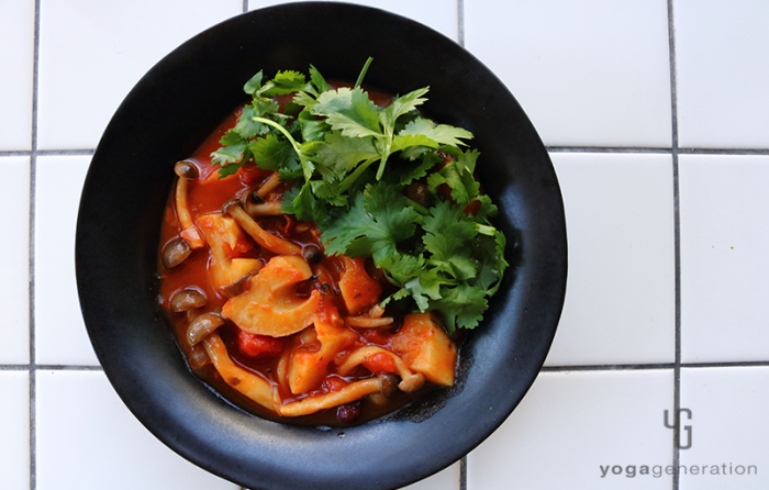 器に盛り付け、パクチーなどの香味野菜を添える。お好みでペッパーソースで辛味を足す。