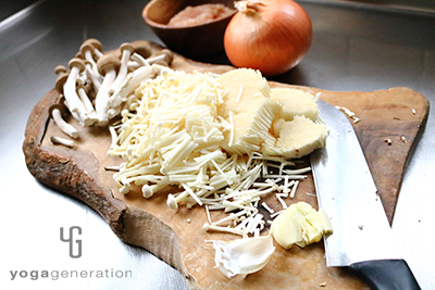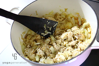 厚手の鍋にエキストラヴァージンオリーブオイルと潰したニンニクを入れて弱火で熱し、ニンニクの香りを油に移す。ニンニクが色づく前に取り出し、ざく切りしたエノキダケと粗みじん切りの玉ねぎ、材料2を加えて中火にし炒める。 -