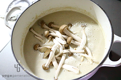 ローリエとシメジを加えて再度火を通し、味見をしながら塩加減を調える。 -