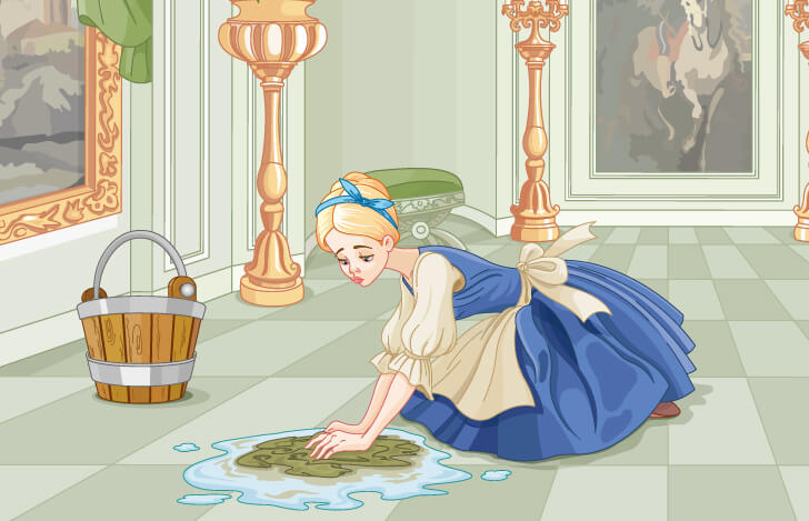 立派な部屋はいじわるな継母と二人の姉に占領されており、エラの部屋は薄暗いお勝手です。エラは、そこで下働きの仕事をさせられているのです。