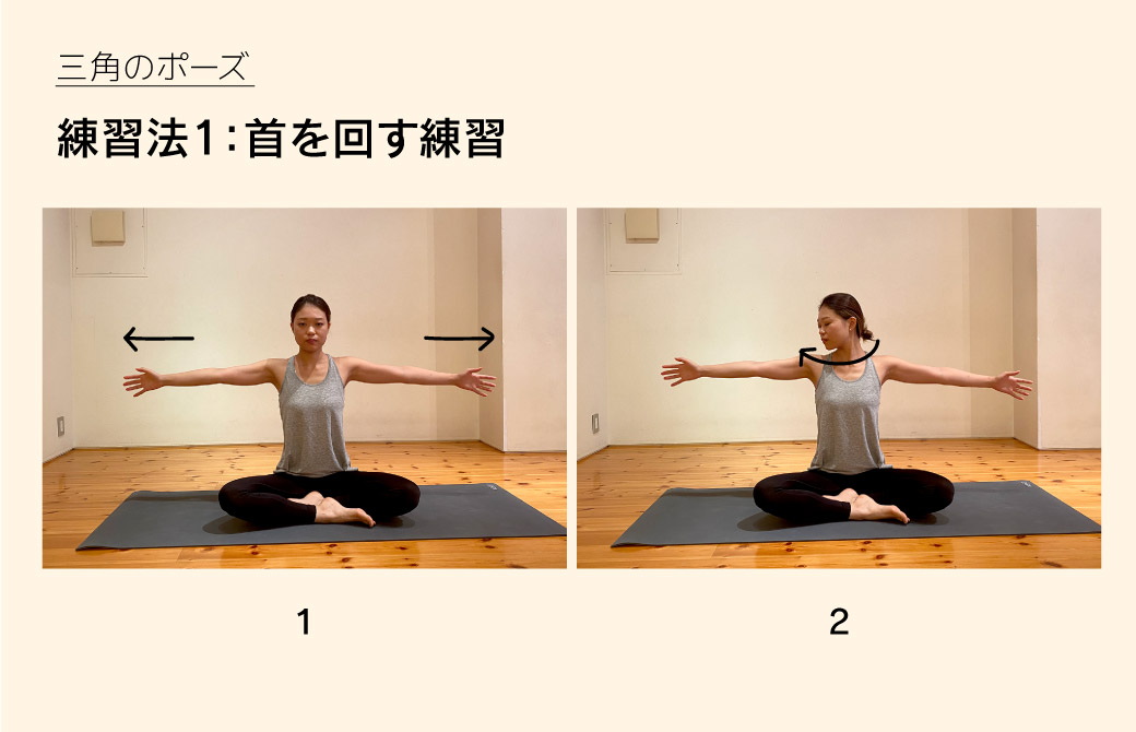 まずはシンプルに首を回す練習をして首の関節、筋肉を動かします。三角のポーズの特徴は身体を傾けてから天井を見るように首を回すこと。これが意外と首の筋肉を使います。