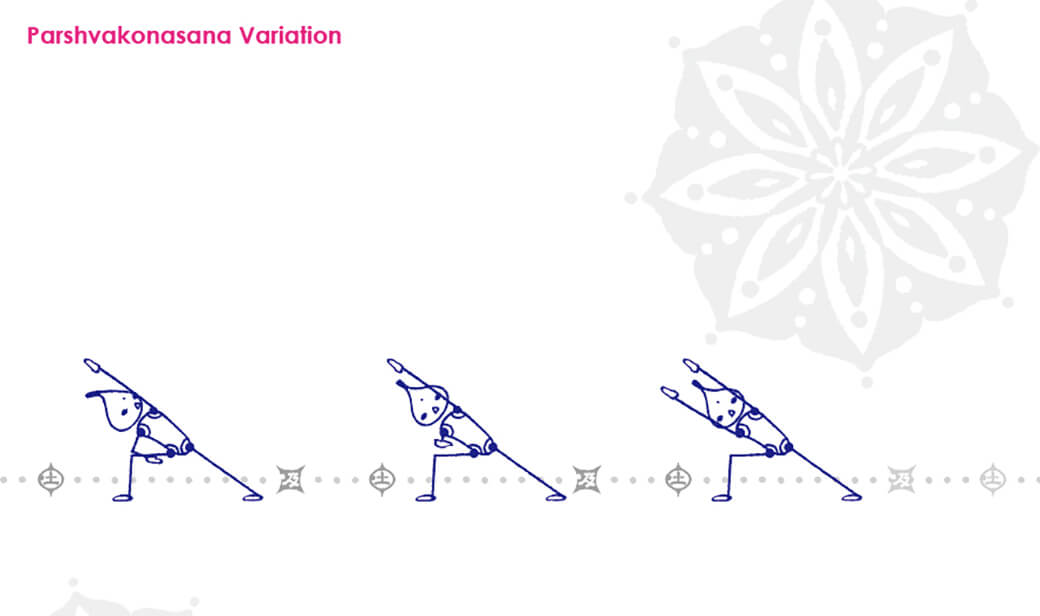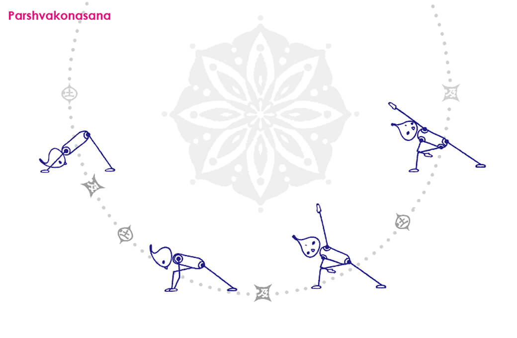 パールシュバコナーサナは「体側を強く伸ばすポーズ」とも言われているように、足から指先までを一直線上に気持ちよく伸ばし、体側へと呼吸を送り込むアーサナです。イラストはレッスンでもよく登場する、ダウンドッグから繋ぐフローです。