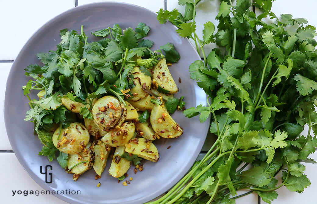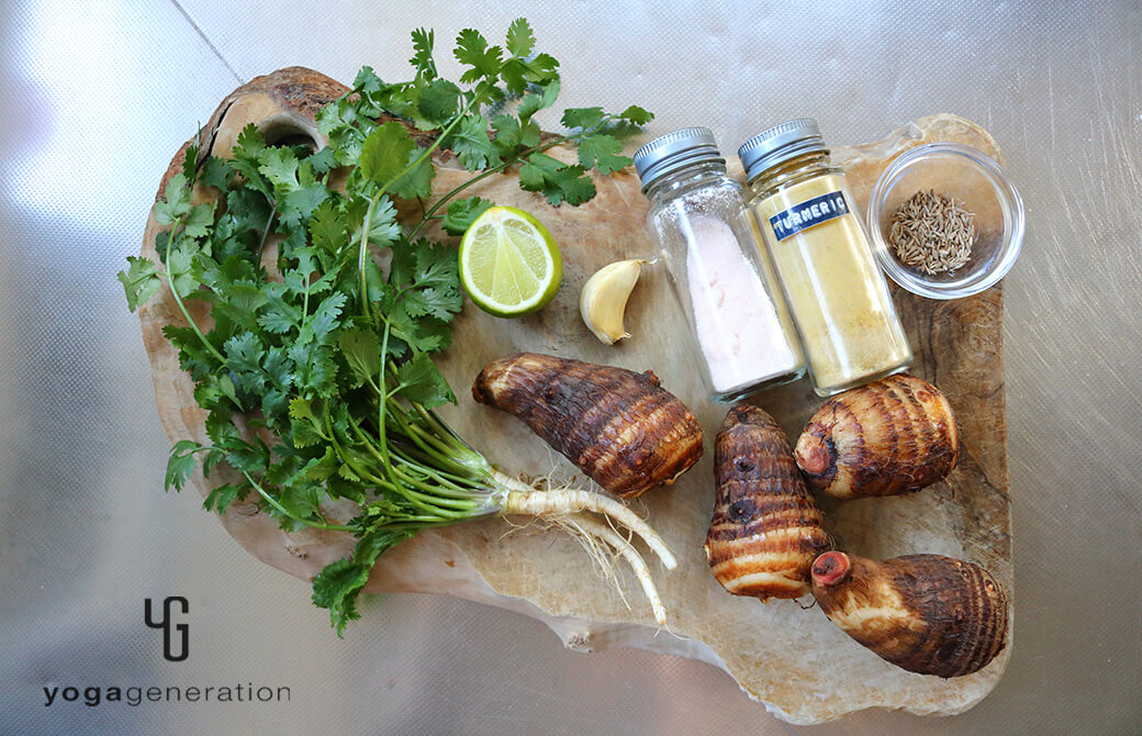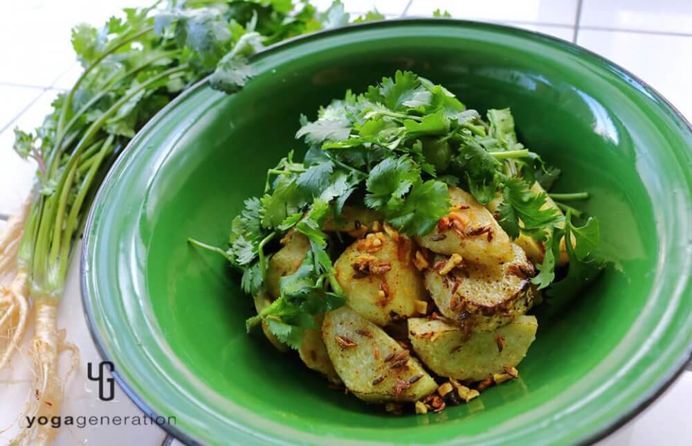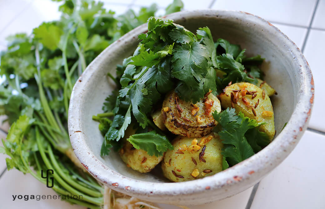 木の器に盛り付けたフレッシュなパクチーと楽しむ、里芋のスパイシー・グリル ナチュラルな木の器も、ターメリックの黄色に色付けられた里芋とパクチーの緑を活かしてくれます。