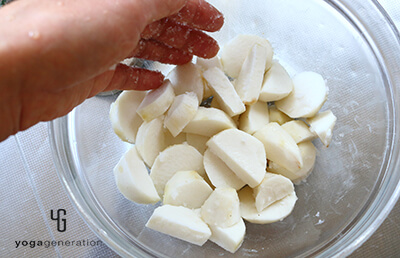1の里芋をオーブンシートに並べて軽く塩を振り、絡める。里芋全体がコーティングさられる量のオリーブオイルを回し入れ、里芋全体に絡める。190〜200度で13分位焼く。竹串を刺し、すっと通ればOK。固ければ火入れ時間を延長して調整する。 -