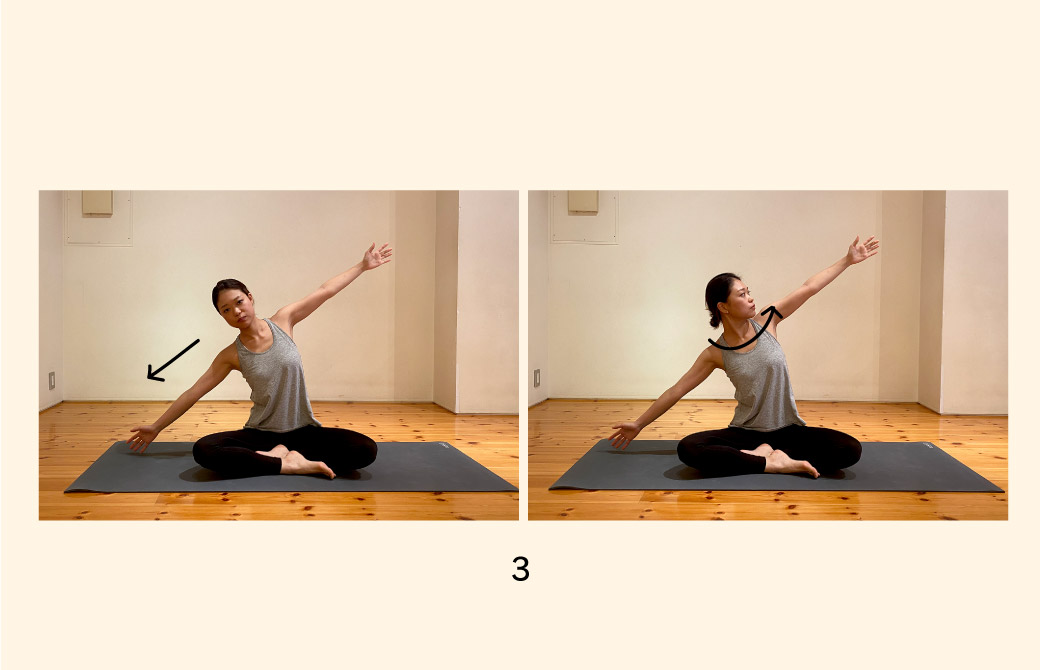 三角のポーズでも紹介したエクササイズです。脊柱から頭部まではまっすぐにして肩のライン上から手を後ろに引きすぎないように心掛けながら行います。
