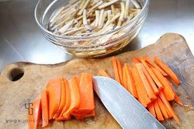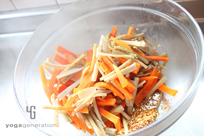 ゴボウは5cm長さに切り、さらに細めの拍子切りにして水にさらしてアク抜きをする。ニンジンもゴボウと同じ大きさに切る。パセリはみじん切りにしておく。 -