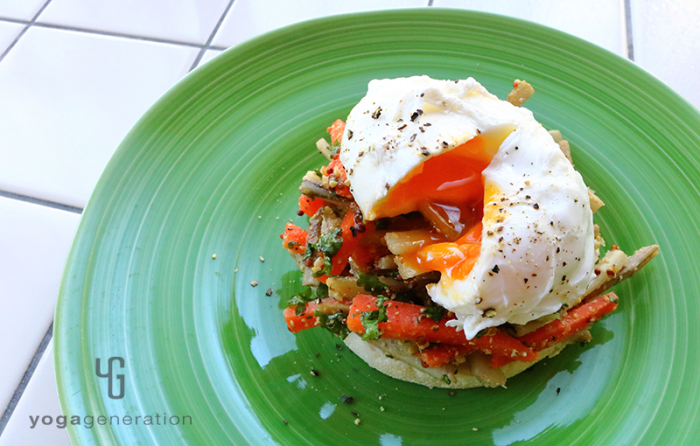 半分に切ってサクッとこんがり焼いたマフィンに乗せて、ポーチドエッグを。トロトロの黄身と絡めながら食べるオープンサンドもオススメです!