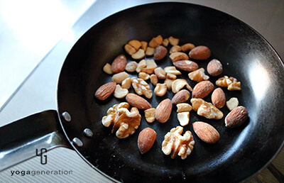 ナッツはフライパンで弱火乾煎り(もしくはトースター低温でトースト)して冷ましておく。冷めたら包丁の腹を軽く押し当て、荒く砕いておく。 -