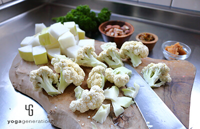 大根は皮付きのままよく洗い、一口大に切る(気になるようなら皮をむく)。カリフラワーも一口大に切り分ける。芯も薄切りにする。 -