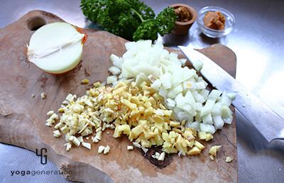 玉ネギはごく粗いみじん切り(7〜8mm角くらい)、ショウガ・ニンニクも粗いみじん切り(3〜4mm角くらい)にする。(※1) -