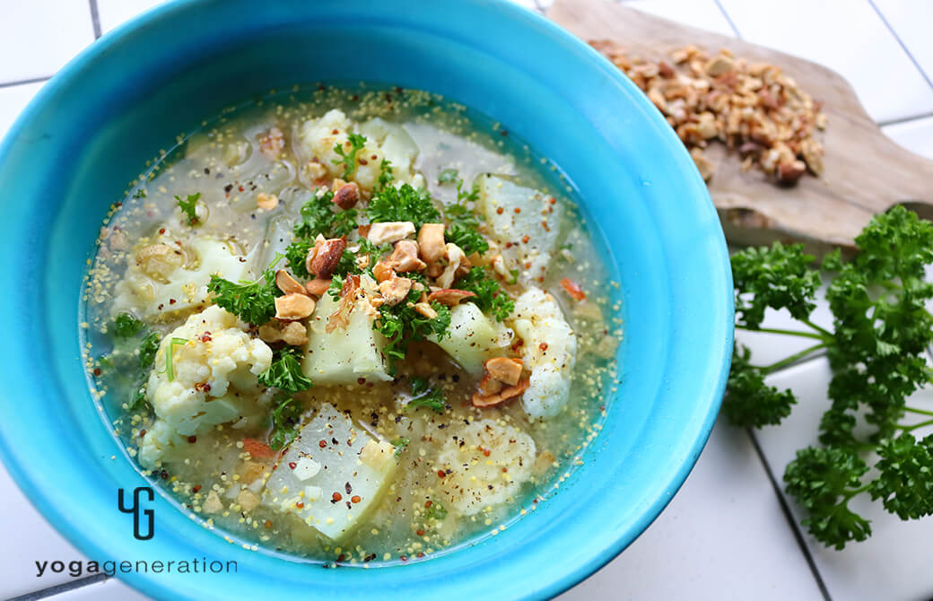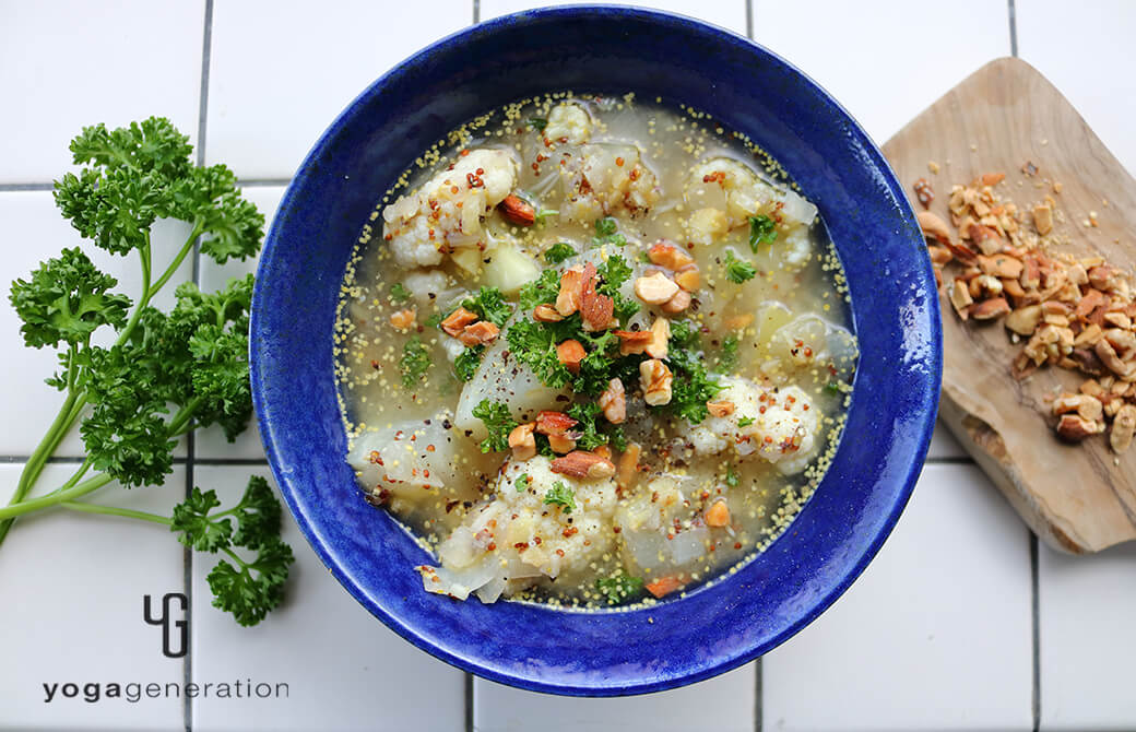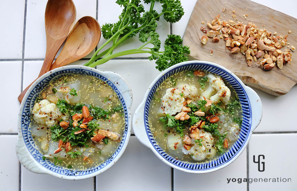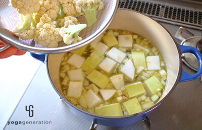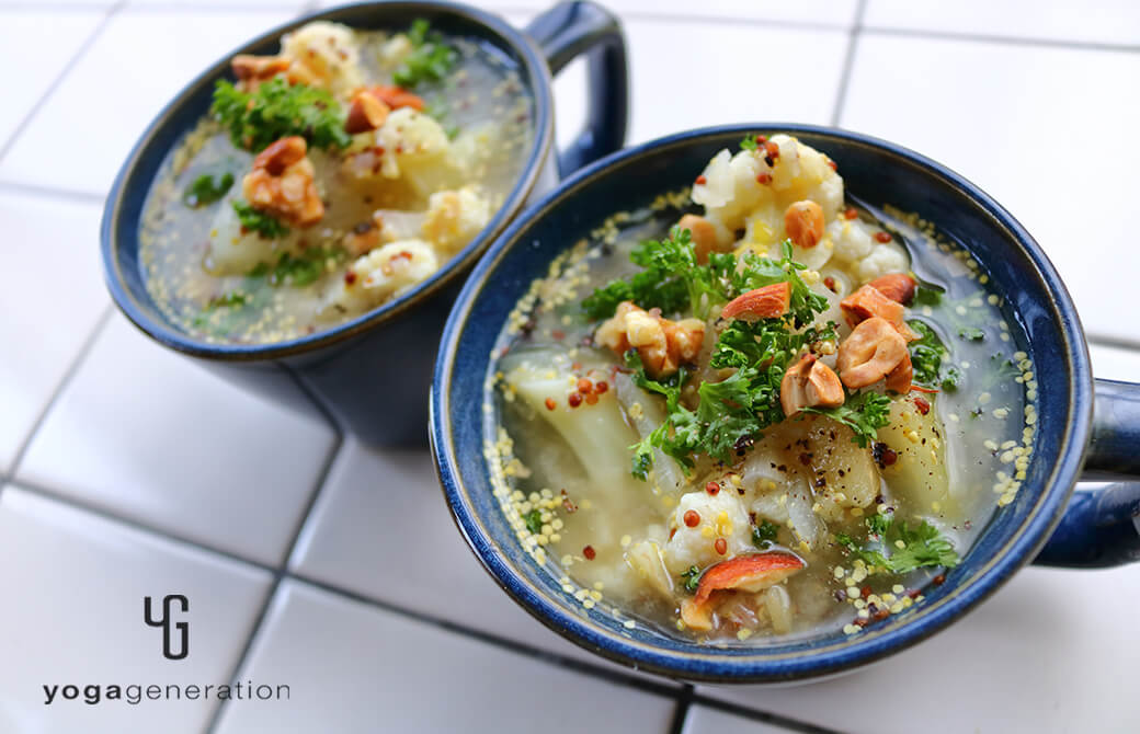 今回は身体温まるスープ。同じく旬のカリフラワーを加え、香味野菜の香りと粒マスタードの酸味で味わいにアクセントを。どこか懐かしい味わいがするのは、日本人にはおなじみのお味噌を使っているから!