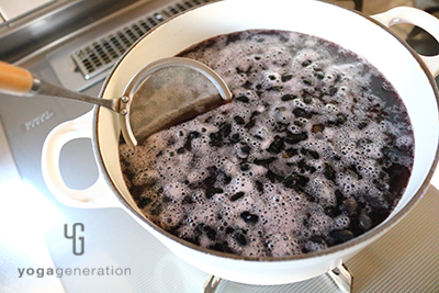 乾燥した黒豆をよく水で洗い、厚手の鍋に入れ、黒豆の3〜5倍の水を入れてかき混ぜ一晩置く。