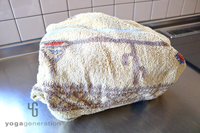 味見をし、プチっとした食感の固めに茹であげたら火からおろし、新聞紙と大きなタオルで包んで冷ましながら余熱で優しく火を入れる。